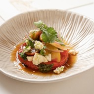 Assemble the dish: place a watermelon steak on a plate and top with the salad.