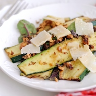 Heat the olive oil in a skillet and sauté the zucchini until golden brown but slightly crisp inside. Transfer to a serving bowl.