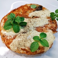 Fry for about 7 more minutes, then transfer to a plate and drizzle with mayonnaise. Garnish with basil leaves.
