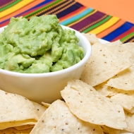 Transfer the guacamole to a serving bowl and place it on a platter. Arrange vegetable chips or pieces of ciabatta around the sauce.