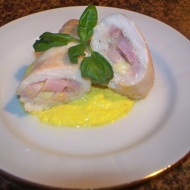 Place cheese, bacon, and finely chopped basil on the chicken fillet. Carefully fold the sides to prevent the filling from leaking and roll it up.