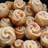 Then, starting from one side, begin to roll it into a tube, and at the edges, you will see our 'roses.' Cut in the middle and place in a dish, 'rose' side up. Repeat with the remaining dough.