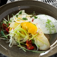 Peel the orange with a knife, removing the skin and cutting out the segments, avoiding the white pith. Thinly slice the fennel, radishes, and cucumber. Mix together.
