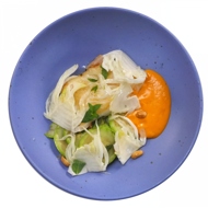 Slice the zucchini into thin rings, dice the chili into small cubes, and chop the garlic finely as well. Thinly slice the fennel and place it in ice water.