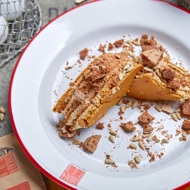 Spread the finished mixture into a tray and bake in the oven at 120°C for 45 minutes. Layer the cream with the cake layers, break the cake into pieces, and arrange them on a plate, garnishing the dish with roasted sunflower seeds and chocolate meringue.