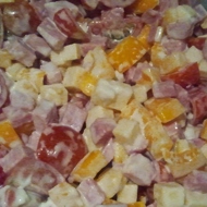 Cut the ham, bell pepper, tomatoes, and cheese into cubes.