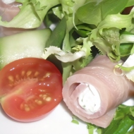 Thinly slice the ham (preferably using a slicer), wrap it around the cottage cheese mixed with finely chopped dill, make rolls, and cut them in half.