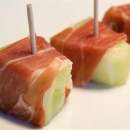 Before serving, wrap the melon pieces with slices of ham and secure with toothpicks.