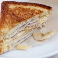 Place 2 slices of cheese, ham, and pieces of banana on the bread. Add another slice of cheese and another slice of ham. Cover with another slice of bread.