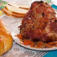Brush the ham with a small amount of glaze and continue roasting the onions and ham, basting every 10 minutes, for another 30 minutes, until a golden crust forms. Transfer the ham and onions to a large platter.