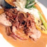 In a skillet, heat a little olive oil and add thinly sliced ham. Lightly brown on both sides. Pour in a small amount of white wine and let it evaporate.