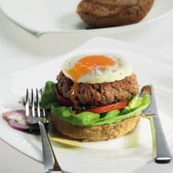 Cut the bun in half, toast it, and spread sauce on it. Place a leaf of lettuce on one half of the bun, followed by a thin slice of a large tomato, the meat, and a fried egg. Next to it, place the second half of the bun and thin rings of red onion.