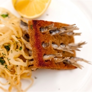 Fry the onion in oil, remove it, and fry the bread in the same oil. Fry the hamsa in the same oil. Squeeze lemon juice over the cooked fish. Insert the fish into the holes in the bread.