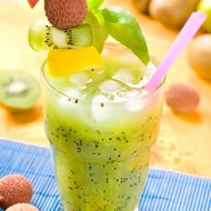 Garnish the rim of the glass with slices of kiwi and starfruit.