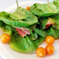 Wrap the turkey in mortadella. Place on the lettuce leaves.