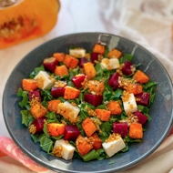 Send the pumpkin pieces to bake in the oven with the beetroot (for about 10–15 minutes).