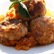 When the meatballs are ready, arrange them on plates, then add a tablespoon of flour mixed with water to the sauce and bring it to a boil. Drizzle the sauce over the meatballs and sprinkle with herbs.
