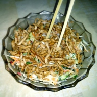 Pour boiling water over the starch noodles for 2 minutes. Rinse in cold water.