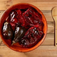 Clean the bell peppers and cut them into large pieces. Cut the zucchini, eggplant, and onion into large pieces (if using baby vegetables, leave them whole). Place the vegetables in the marinade, mix, cover with plastic wrap, and refrigerate for 2 hours.