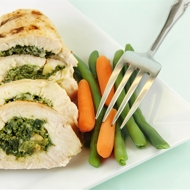 Stuff the mixture under the skin of the chicken breasts. Place the chicken in a greased ovenproof dish and bake at 356°F for 30 minutes.