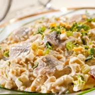 Mix the apples and onion with the herring, corn, and green peas. Dress with vegetable oil.