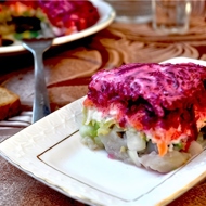 The top layer is grated beetroot, spread with mayonnaise, and refrigerate for an hour to infuse.