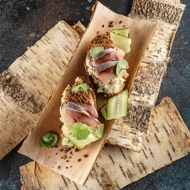 Dice half of the herring fillet into small cubes and slice the other half for garnish. Add the diced herring to the filling with the mashed potatoes, season with fragrant oil, and drizzle with lemon juice.