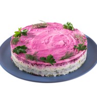 The iconic Soviet salad 'Herring Under a Fur Coat,' whose recipe slightly varies based on the preferences and views of the cook, but whose essence remains unchanged – a strong union of sweet beets and salted fish. The rest is optional. Some add more onions, while others consider it a crime to prepare the salad with apple – in this recipe, it is included and works wonderfully, providing freshness and slightly mellowing the bold flavor of the herring.
