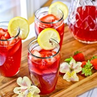Place the strawberries and sugar in a heatproof container over simmering water. Let sit for 25 minutes to allow the strawberries to release their juice. Carefully strain through a sieve into the pitcher.