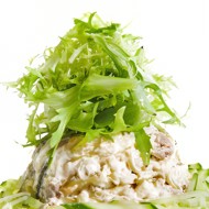 Finely chop the canned squid, boiled salmon (without bones), sweet and sour apples, canned gherkins, and several boiled potatoes.