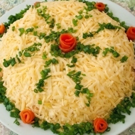 Sprinkle the finished salad with grated cheese, garnish, and let it soak.