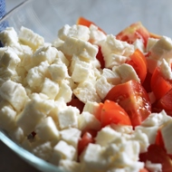 The difference from the classic presentation of Caprese salad, where the ingredients are layered and you can taste each ingredient, is that in this version, you get a ready-made mix in your mouth, and the pleasure comes instantly.