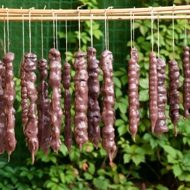 Allow the churchkhela to drain slightly over the pot, then hang it to dry in a pre-prepared location.