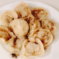 Tear off a piece of dough about the size of half a fist, roll it into a ball, and roll it out as thinly as you can (1 — sprinkle flour on the surface where you will roll out the dough, and also dust the rolling pin with flour. 2 — the dough shouldn’t be too thin, or it will tear; finding the right balance can only be achieved by making a couple of mistakes. 3 — if you made the 'right' dough, you won’t have problems rolling it out, but if it requires noticeable physical effort to roll, something is wrong). Generously dust the dumpling mold with flour; if you don’t do this, the dough will stick, and you won’t be able to remove the finished dumplings. Place the rolled-out dough circle onto the mold, pressing it down lightly with your finger, fill the cavities with the filling, and when all the cavities are filled, roll out another circle of dough and cover the mold with it. Dust with flour and roll over it with the rolling pin to press down the edges around all the dumplings. Flip the mold and tap it a couple of times on the board; when all the dumplings fall out, dust a plate with flour, place the finished product on it, and put it in the freezer.