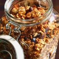Spread the oats, nuts, and dried fruits on a parchment-lined baking sheet, and drizzle with the mixture.
