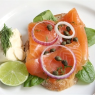 Remove excess brine from the salmon. Cut into 24 equal pieces. Arrange the fish in a fan shape on chilled serving plates. Before serving, add a spoonful of the cream on each plate. Garnish with chives and lemon.