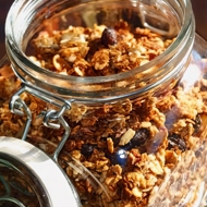 Heat the butter and mix it with honey and cocoa powder. Pour the mixture over the oats and nuts and mix thoroughly.