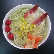 You can color the noodles by adding the following colorings: Red - two tablespoons of tomato paste Green - two tablespoons of pureed spinach Black - one tablespoon of cuttlefish ink