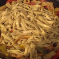 Add the noodles and sauce, mix well for a couple of minutes, and serve.
