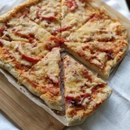 Cut the finished pizza into portioned slices. Enjoy your meal!
