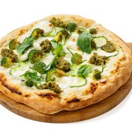 Once the pizza is ready, spread pesto on top and serve, garnished with basil leaves.
