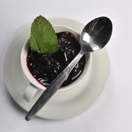 Take out of the freezer, blend again, pour the sorbet into a serving dish, and garnish with berries and mint leaves.