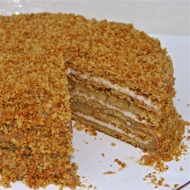 Shape the finished cake layers evenly and spread them with cream: one can of sweetened condensed milk + one stick of unsalted butter (at room temperature). Mix well.