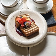 To serve on a plate, place the blackberry jam, then top it with a piece of honey cake. Garnish with seasonal berries and flowers.