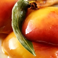 Wash the peaches, blanch them in boiling water, and immediately immerse them in a bowl of ice water. After these procedures, the skin will come off easily. Cut the fruits in half and remove the pits.