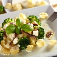 Break a small head of broccoli into florets and boil for 10-12 minutes, then drain and mix with the pasta.