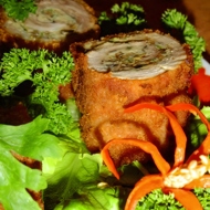 Remove the toothpicks from the fried roll and slice it into pieces. Garnish with herbs. Serve hot.