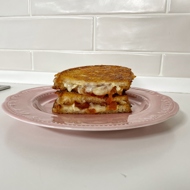 When the bread is golden brown on the bottom, spread butter on the top slice and flip the bread over. Continue to toast without a weight.