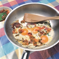 Crack the eggs into the skillet, add the tomato-pepper sauce (by the way, it's called rancheros, and huevos refers to the eggs), and cook until done.