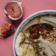 This is how they prepare hummus at a popular eatery in Moscow. The hummus with fig has a sweet, spicy, and slightly tangy flavor all at once. Take fresh figs, finely chop them after peeling off the skin, and then fold them into the hummus. Do the same with ginger. Together, they provide a noticeable taste of freshness, juiciness, and light sweetness—this sweetness is subtle, not dessert-like. This hummus doesn't have to be served hot.